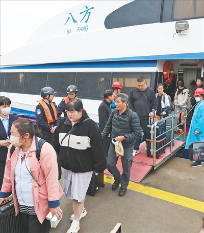 4月3日,在福建泉金客运船埠,搭客走出泉金“小三通”客运航路“八方”轮。近日,好多台胞通过权衡泉州和金门的泉金“小三通”客运航路来到福建寻根踏青,泉金客运船埠迎来晴明节两岸东说念主员来回岑岭。新华社记者姜克红摄