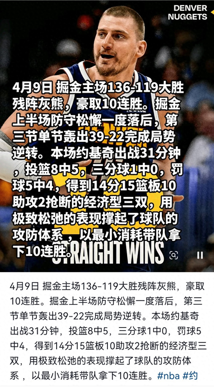 北京本领4月9日,NBA旧例赛,丹佛掘金主场以136-119大捷缺兵少将的孟菲斯灰熊,豪取10连胜,而灰熊则碰到6连败。