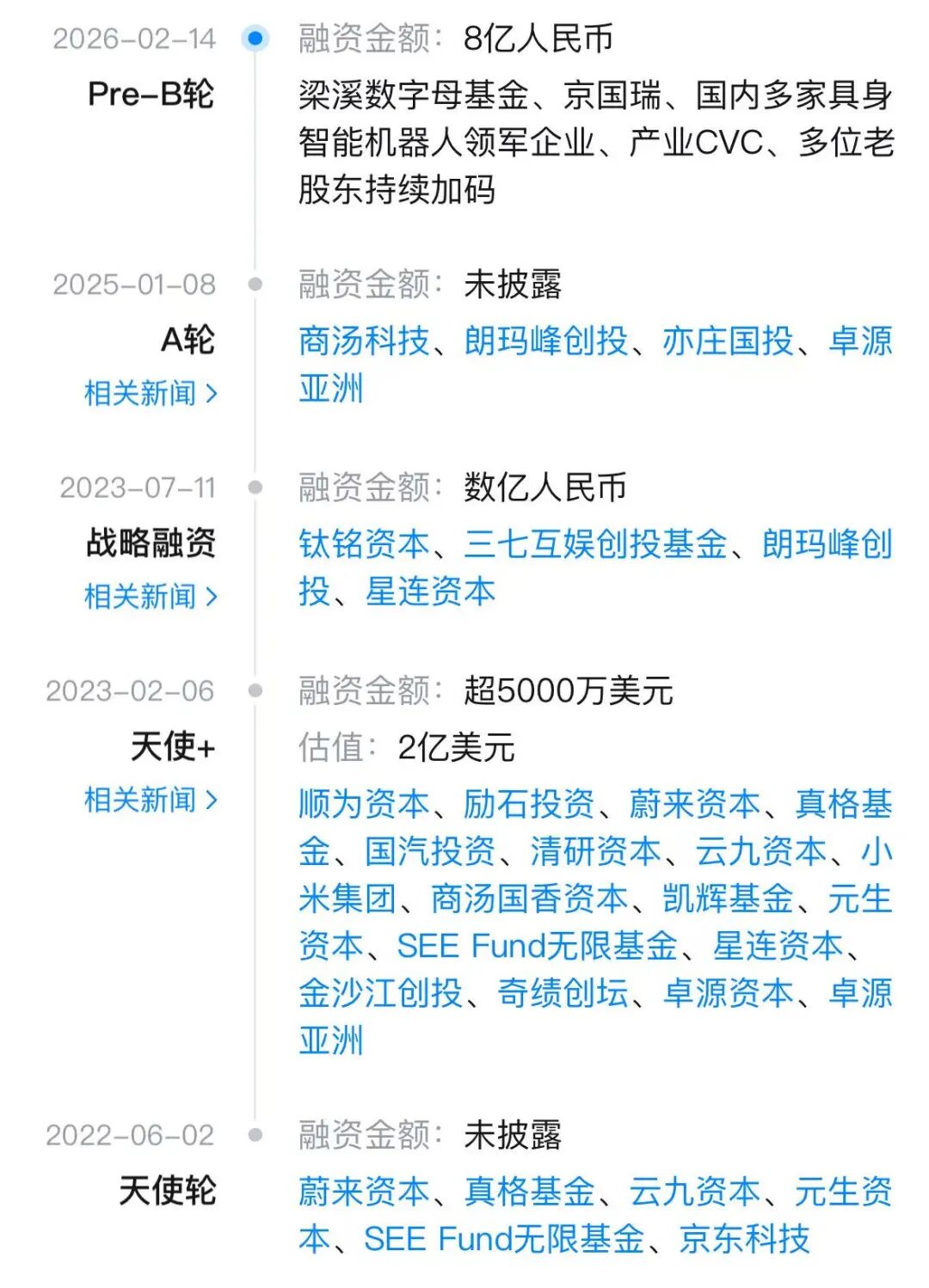 2026年2月,公司书记完成超8亿元Pre-B轮融资,投资方包括梁溪数字母基金、京国瑞基金等产业指导基金,以及多居品身智能机器东说念主领军企业、产业CVC及资深产业投资东说念主。