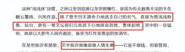 唐小林就在著作中泄露,贾淡淡诗歌走红的原因,是因为她有一个好爸爸,贾平凹用我方的名气,为犬子吆喝、站台。而一帮拍贾平凹马屁的文体品评家,作念起了情面交易,集体为贾淡淡站台。